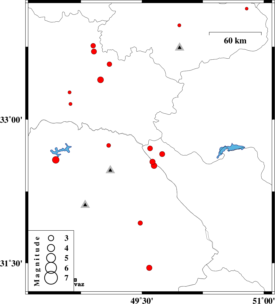2013/07/18 | 09:40:16.2 | 14:10:16.2 | 33.97 | 49.96 | 9 | ML:1.8 | Markazi Province, 28 km South-East of Arak | ||