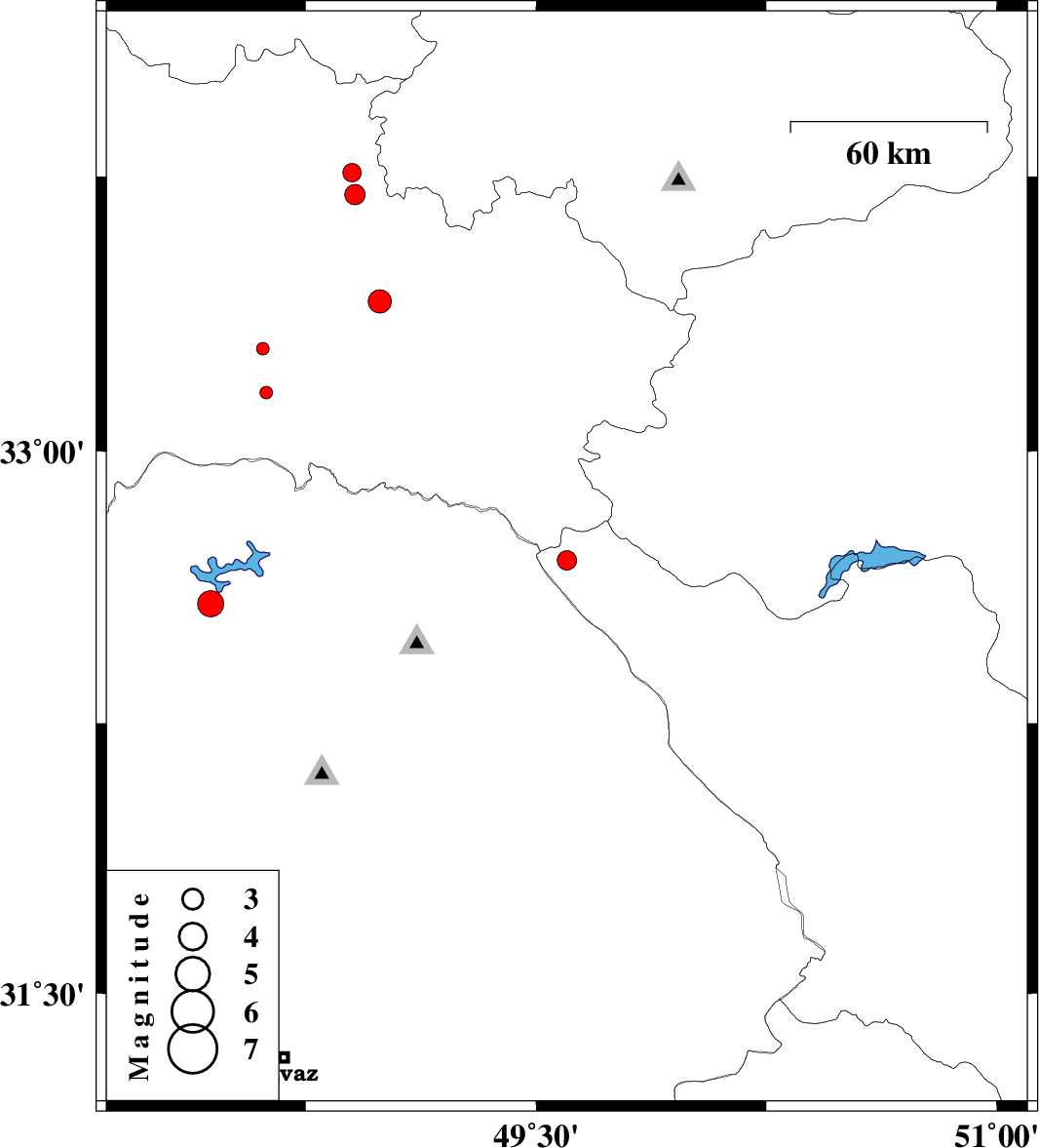 2013/08/01 | 21:40:21.2 | 02:10:21.2 | 33.16 | 48.62 | 14 | ML:1.8 | Lorestan Province, 44 km South-East of Khorramabad | ||