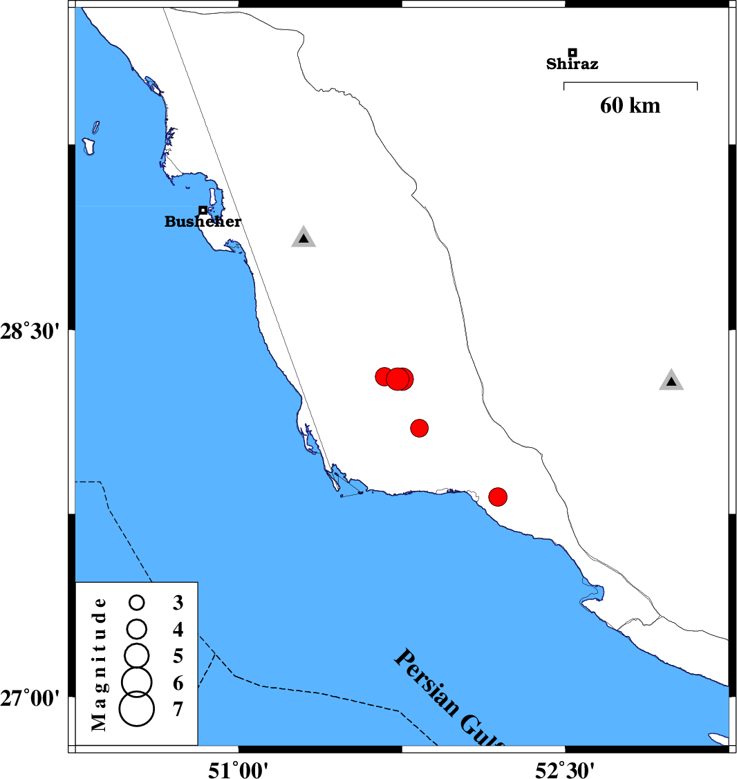 2013/08/10 | 17:05:33.7 | 21:35:33.7 | 28.3 | 51.75 | 15 | ML:4.7 | Bushehr Province, 54 km South-East of Khormog | ||