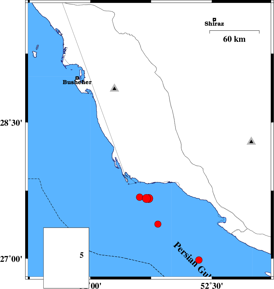 2013/08/10 | 17:05:33.7 | 21:35:33.7 | 28.3 | 51.75 | 15 | ML:4.7 | Bushehr Province, 54 km South-East of Khormog | ||
