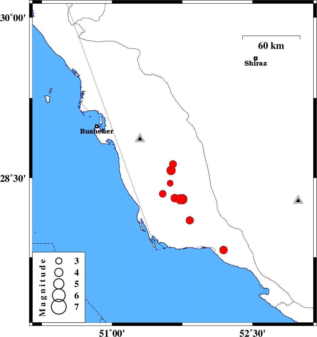 2013/08/03 | 13:21:36.6 | 17:51:36.6 | 27.82 | 52.19 | 35 | ML:3.8 | Bushehr Province, 13 km East of Bandar-e kangan | ||