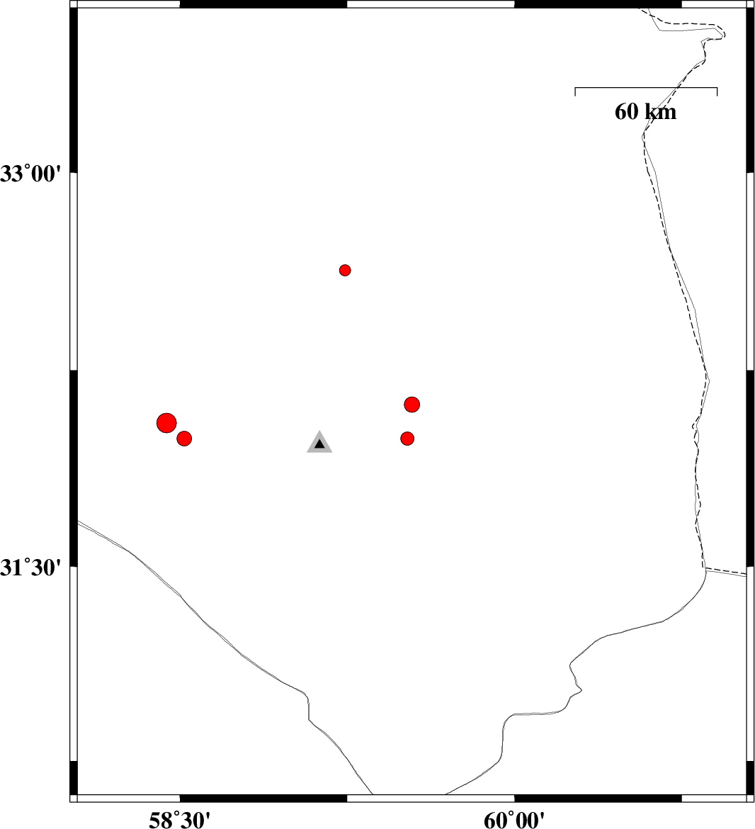 2013/08/16 | 15:42:50.6 | 20:12:50.6 | 31.99 | 58.52 | 14 | ML:3 | Khorasan(south) Province, 121 km South-West of Birjand | ||