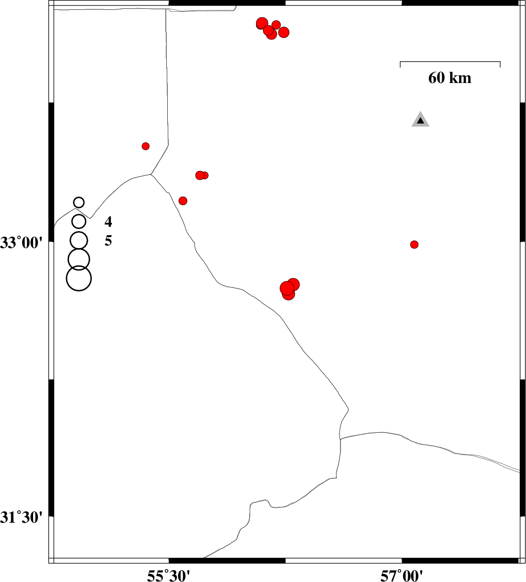 2013/08/10 | 12:08:01.6 | 16:38:01.6 | 33.85 | 56.7 | 13 | ML:4.3 | Yazd Province, 34 km North-West of Tabas | ||