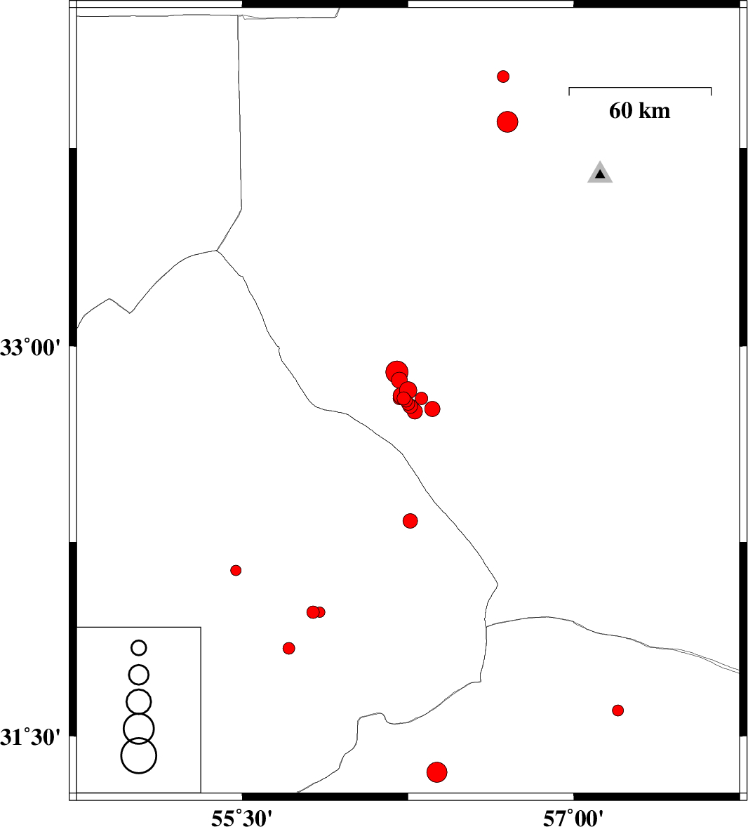 2013/08/10 | 12:08:01.6 | 16:38:01.6 | 33.85 | 56.7 | 13 | ML:4.3 | Yazd Province, 34 km North-West of Tabas | ||