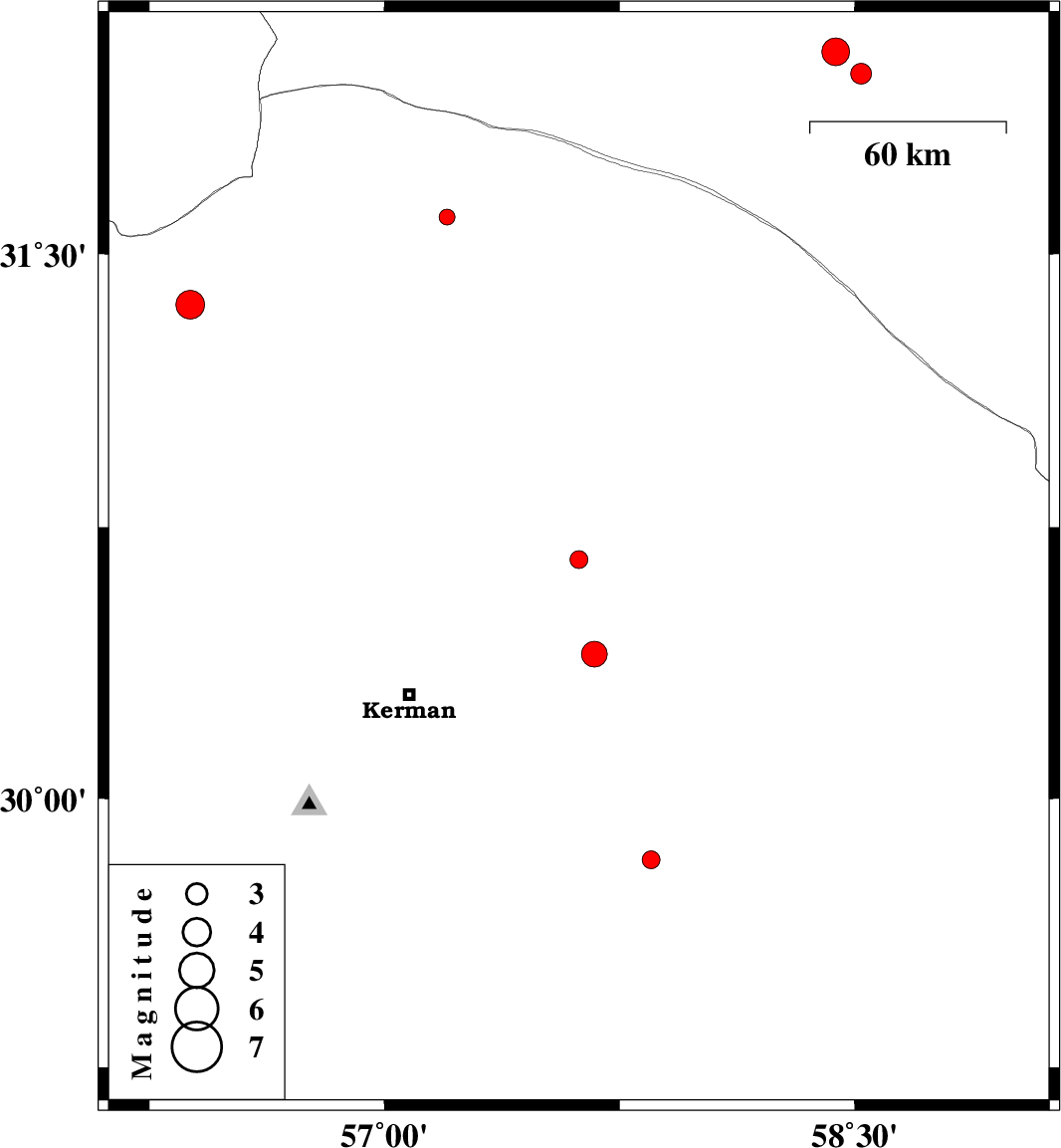 2013/08/06 | 03:48:50.9 | 08:18:50.9 | 30.4 | 57.67 | 18 | ML:3.7 | Kerman Province, 58 km North-East of Kerman | ||
