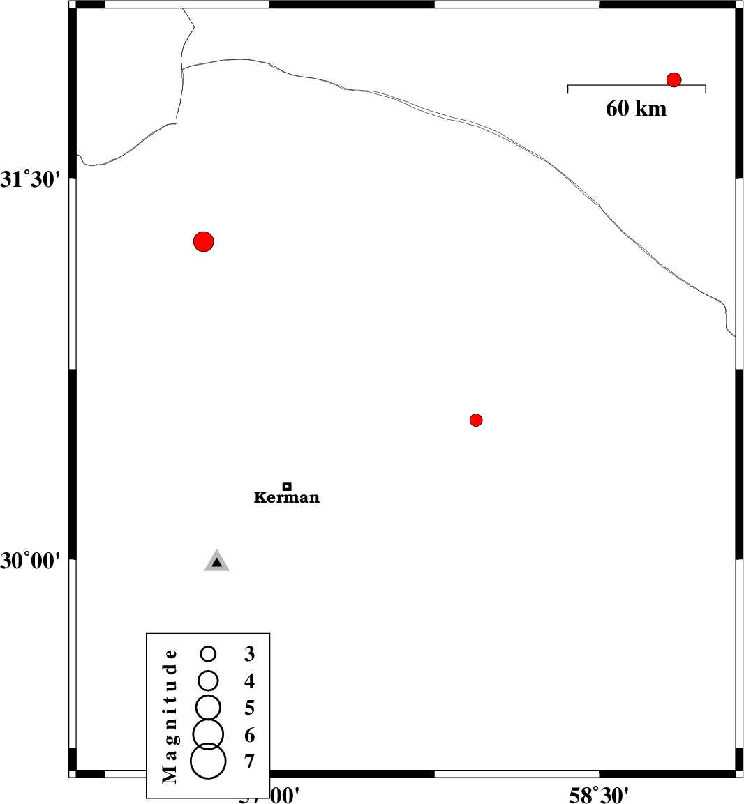 2013/08/14 | 16:36:30.6 | 21:06:30.6 | 31.36 | 56.38 | 14 | ML:4.1 | Kerman Province, 42 km West of Ravar |