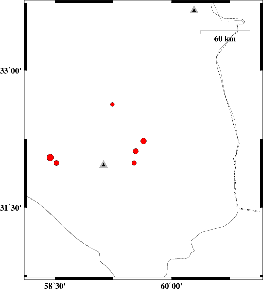 2013/08/16 | 15:42:50.6 | 20:12:50.6 | 31.99 | 58.52 | 14 | ML:3 | Khorasan(south) Province, 121 km South-West of Birjand | ||