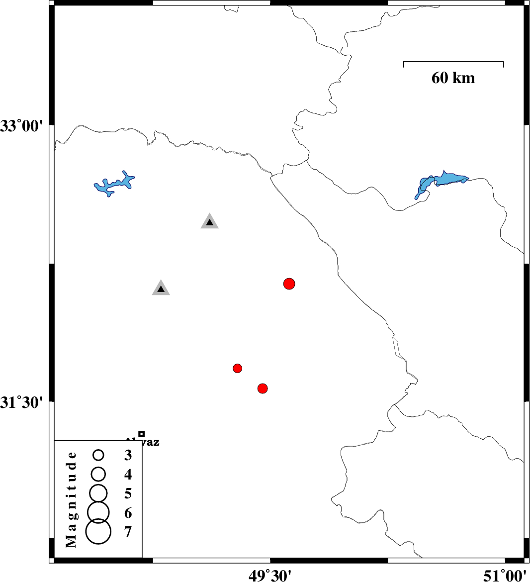 2013/08/24 | 04:16:34.5 | 08:46:34.5 | 31.57 | 49.45 | 37 | ML:2.8 | Khoozestan Province, 36 km North-West of Ramhormoz | ||