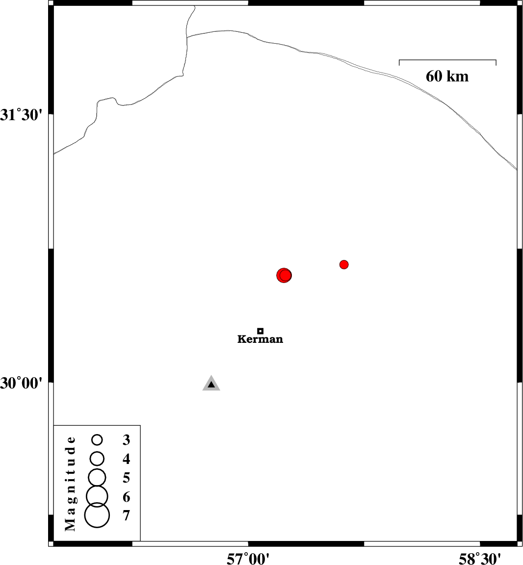 | 2013/08/21 | 01:26:40.3 | 05:56:40.3 | 30.66 | 57.62 | 14 | ML:2.5 | Kerman Province, 66 km North-East of Kerman |