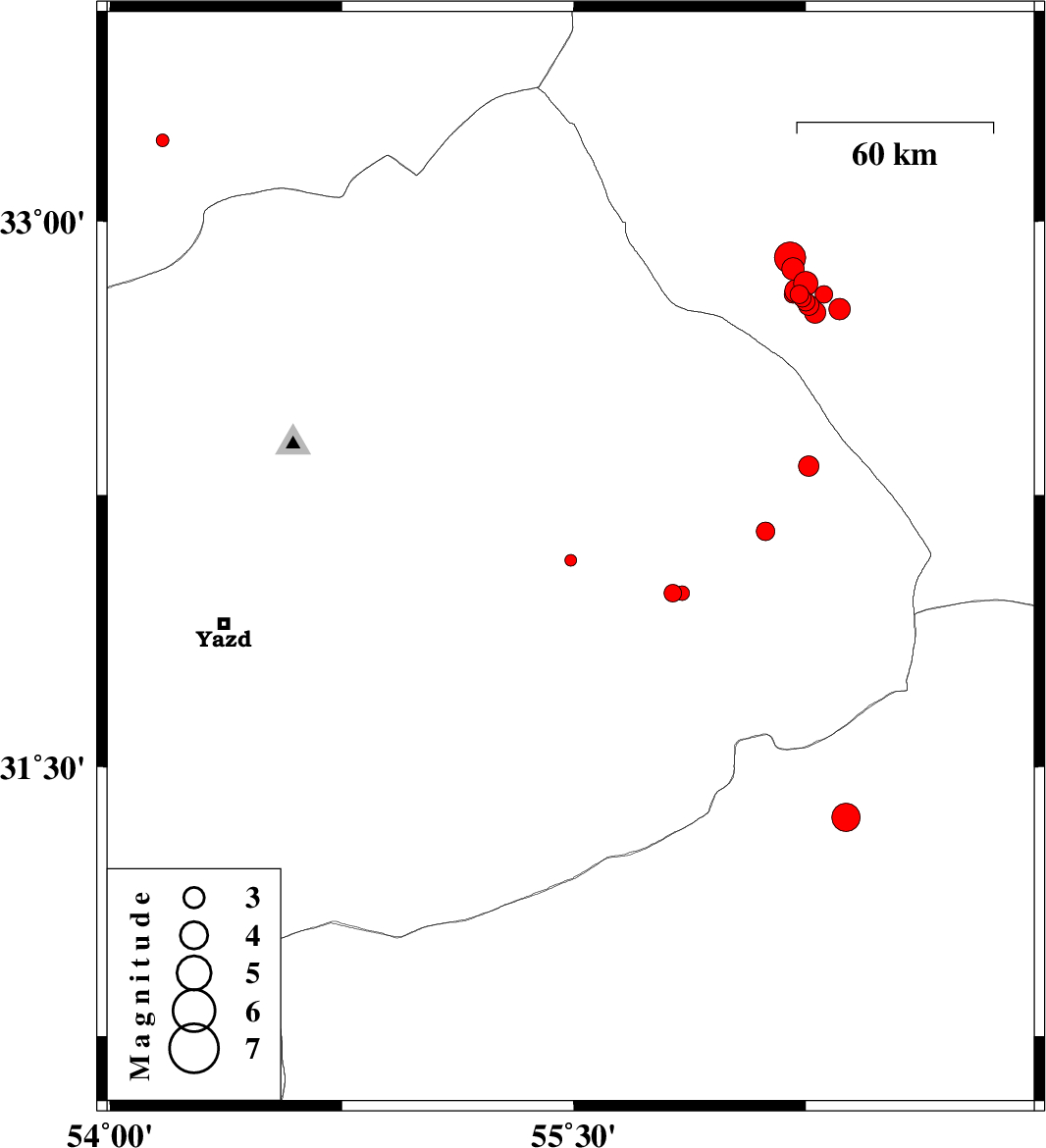 2013/08/17 | 01:33:44.1 | 06:03:44.1 | 32.8 | 56.21 | 6 | ML:2.5 | Yazd Province, 111 km South-West of Tabas | ||
