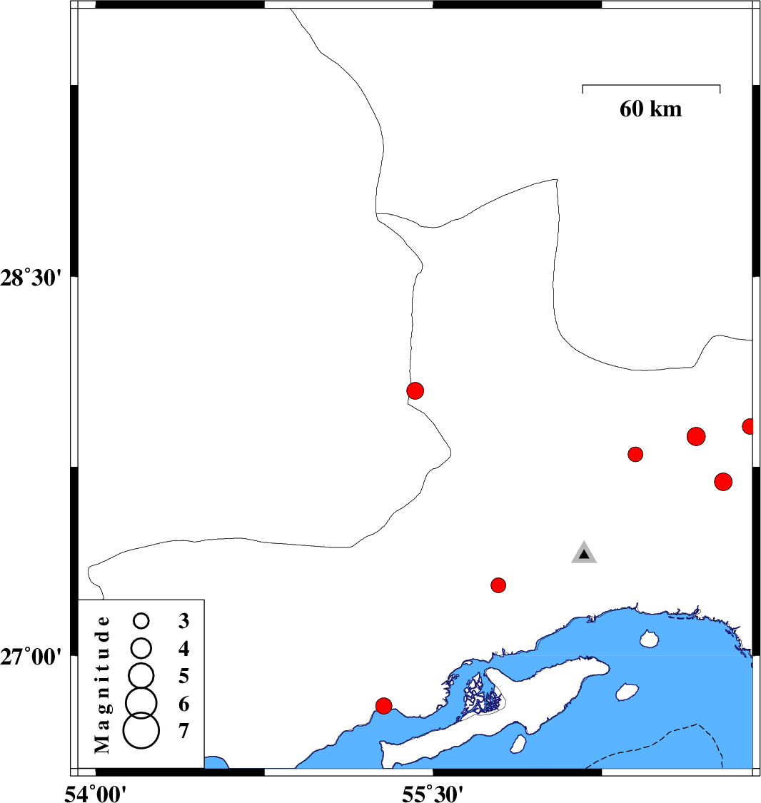 | 2013/08/06 | 00:08:20.0 | 04:38:20.0 | 27.28 | 55.79 | 18 | ML:3 | Hormozgan Province, 50 km West of Bandar-e abbas |