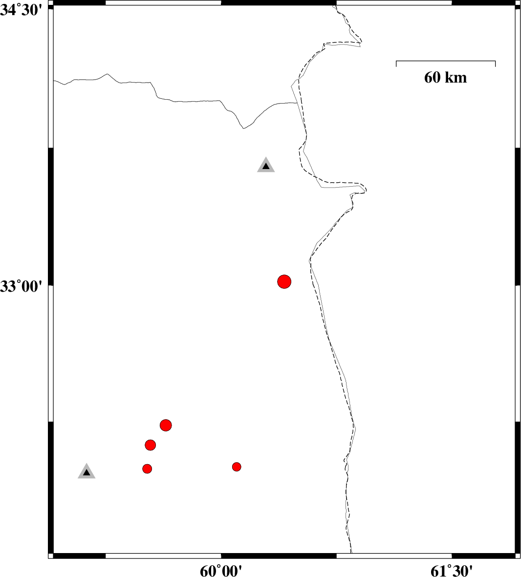 2013/08/27 | 01:22:16.1 | 05:52:16.1 | 32 | 60.1 | 17 | ML:2.6 | Khorasan(south) Province, 52 km North of Nehbandan | ||