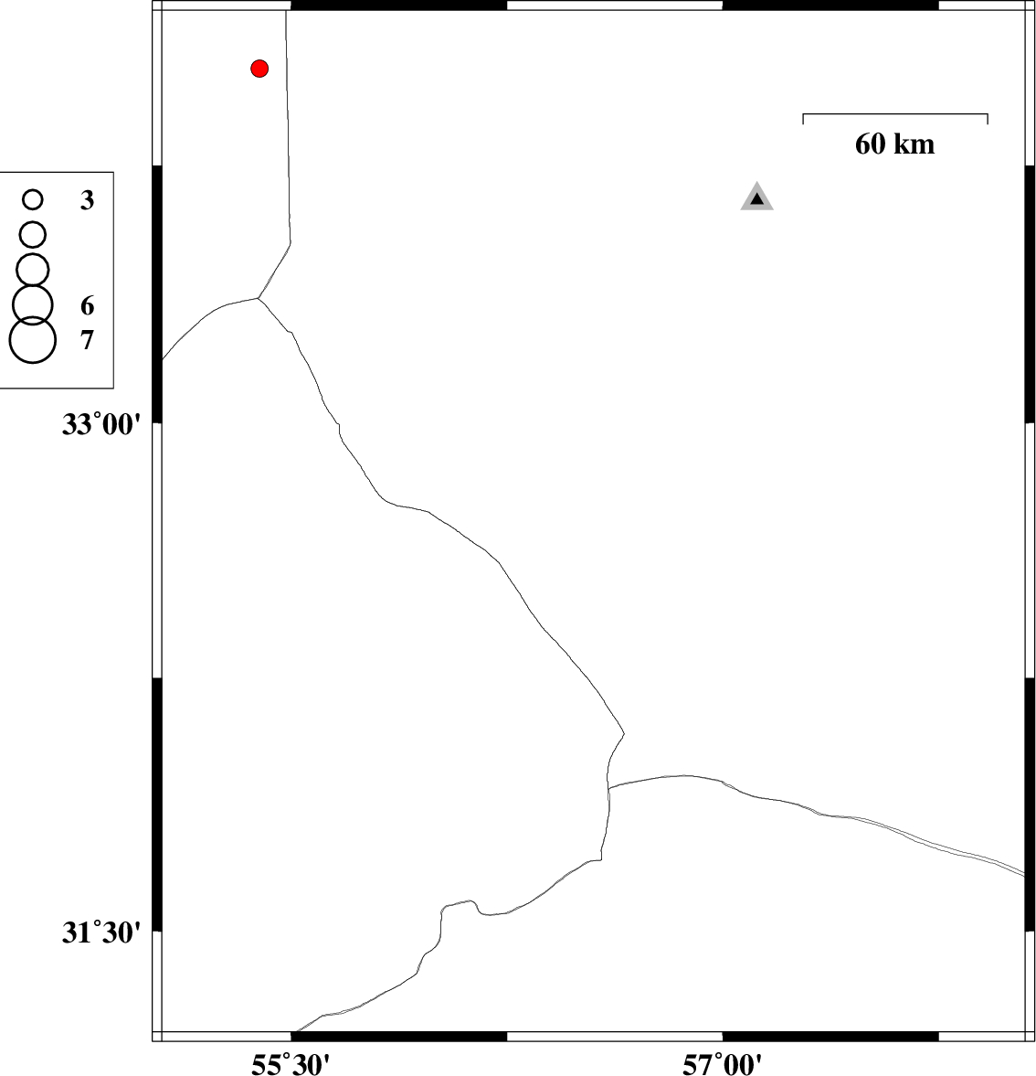 2013/08/27 | 22:54:00.4 | 03:24:00.4 | 32.7 | 56.55 | 15 | ML:3.1 | Yazd Province, 106 km South-West of Tabas | ||
