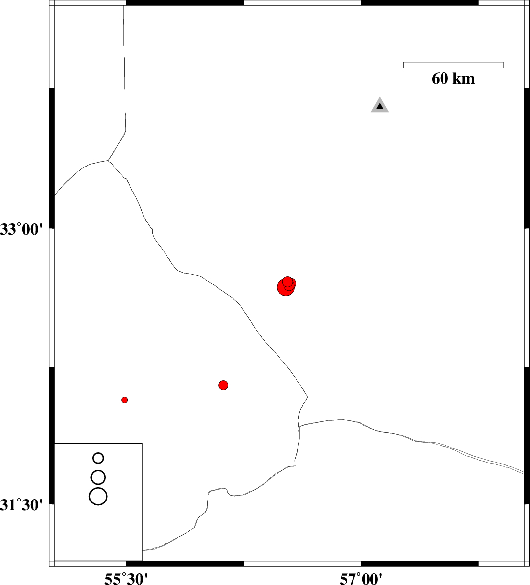 2013/08/27 | 22:54:00.4 | 03:24:00.4 | 32.7 | 56.55 | 15 | ML:3.1 | Yazd Province, 106 km South-West of Tabas | ||