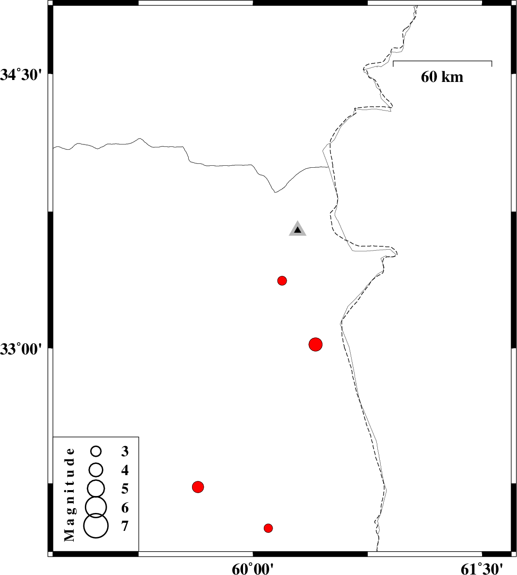 2013/08/27 | 01:22:16.1 | 05:52:16.1 | 32 | 60.1 | 17 | ML:2.6 | Khorasan(south) Province, 52 km North of Nehbandan | ||