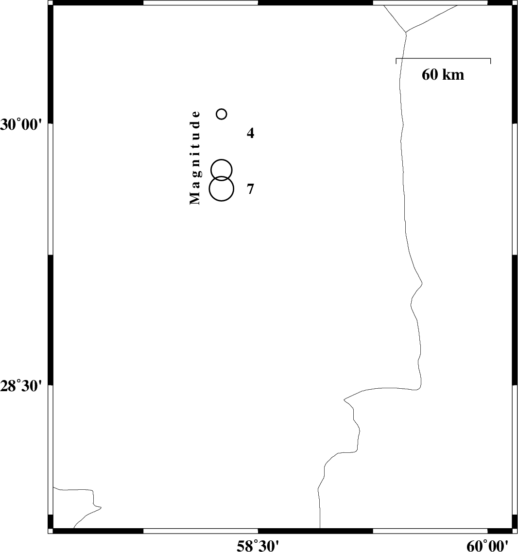 2013/09/02 | 00:36:10.3 | 05:06:10.3 | 29.17 | 58.66 | 14 | ML:3.2 | Kerman Province, 31 km East of Bam | ||