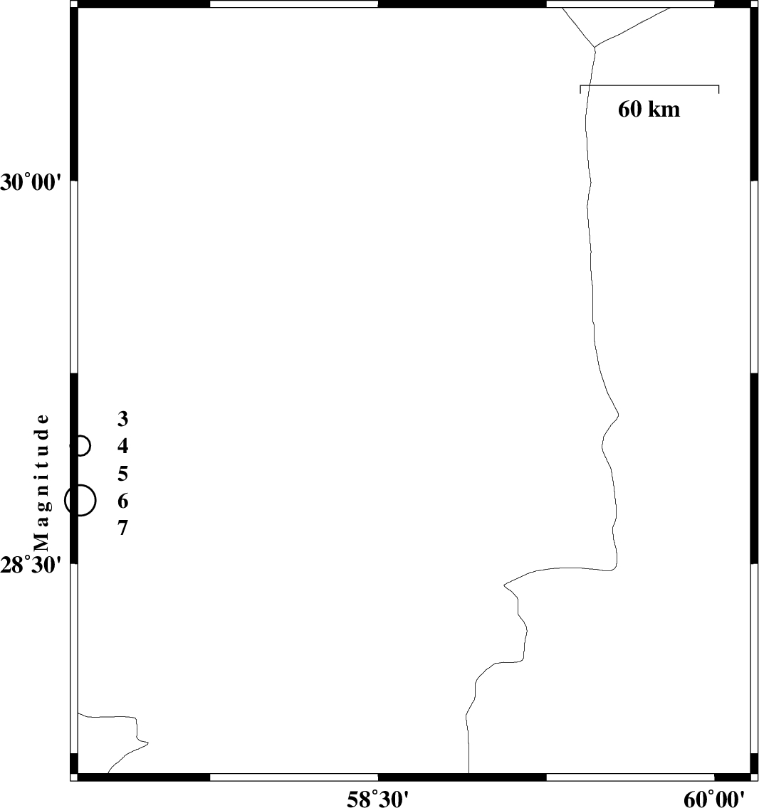 2013/09/02 | 00:36:10.3 | 05:06:10.3 | 29.17 | 58.66 | 14 | ML:3.2 | Kerman Province, 31 km East of Bam |