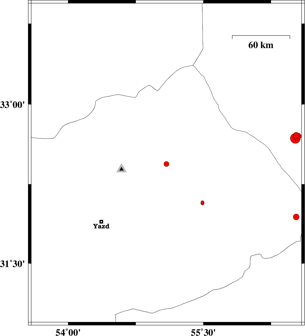 2013/08/26 | 13:28:32.7 | 17:58:32.7 | 32.07 | 55.49 | 14 | ML:1.7 | Yazd Province, 53 km North of Bafq |