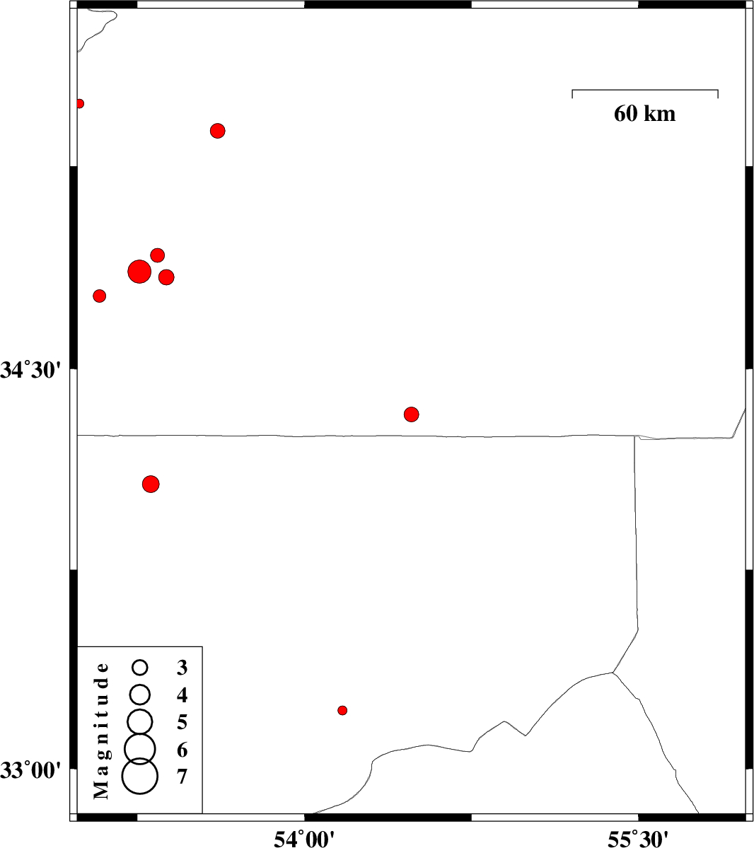 2013/08/19 | 04:45:06.7 | 09:15:06.7 | 33.22 | 54.17 | 6 | ML:1.8 | Esfahan Province, 101 km North-East of Ardakan | ||