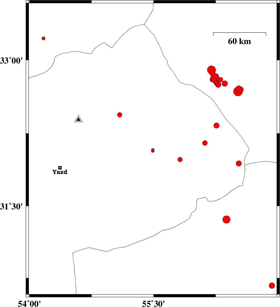 2013/08/28 | 02:03:44.1 | 06:33:44.1 | 32.69 | 56.54 | 15 | ML:2.9 | Yazd Province, 108 km South-West of Tabas | ||