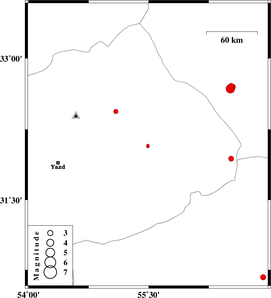 2013/08/26 | 13:28:32.7 | 17:58:32.7 | 32.07 | 55.49 | 14 | ML:1.7 | Yazd Province, 53 km North of Bafq |