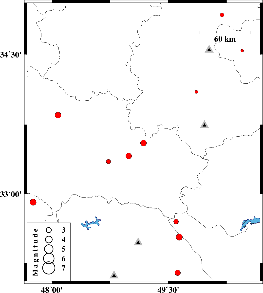 2013/08/06 | 07:33:39.1 | 12:03:39.1 | 32.91 | 47.76 | 14 | ML:3.6 | Ilam Province, 27 km South of Pol-e dokhtar | ||