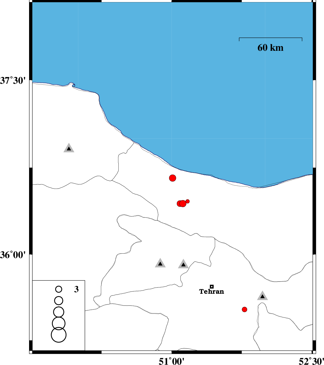 2013/09/12 | 02:32:32.4 | 07:02:32.4 | 36.66 | 51.01 | 14 | ML:3.2 | Mazandaran Province, 20 km South-East of Tonekabon | ||