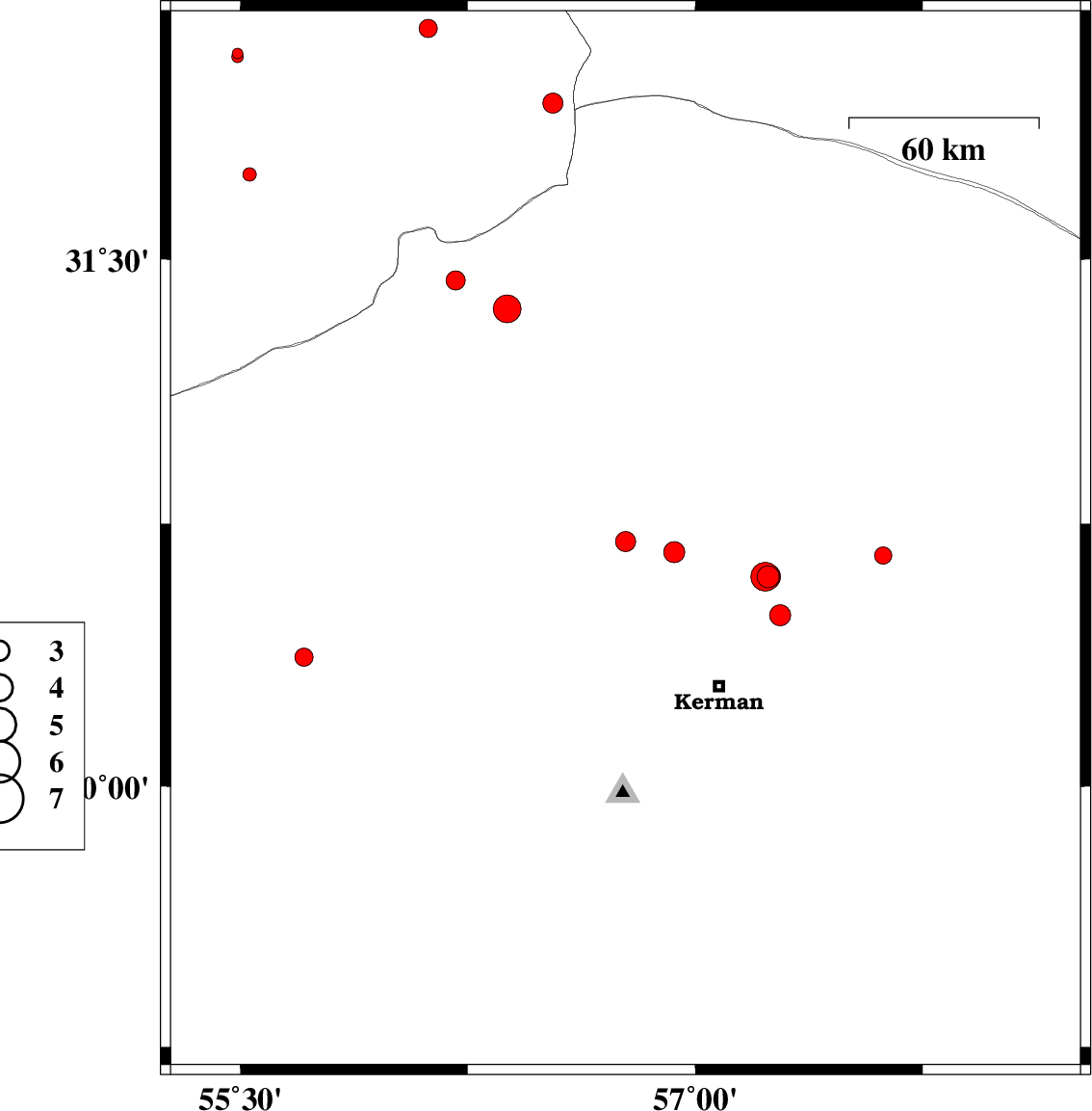 2013/09/07 | 23:20:08.2 | 03:50:08.2 | 30.49 | 57.28 | 14 | ML:3.1 | Kerman Province, 29 km North-East of Kerman | ||