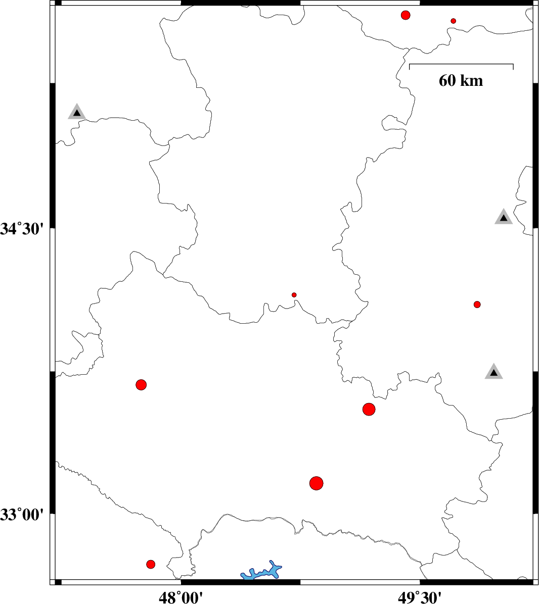 2013/09/13 | 00:25:49.9 | 04:55:49.9 | 33.16 | 48.85 | 14 | ML:3.8 | Lorestan Province, 41 km South-West of Dorud | ||