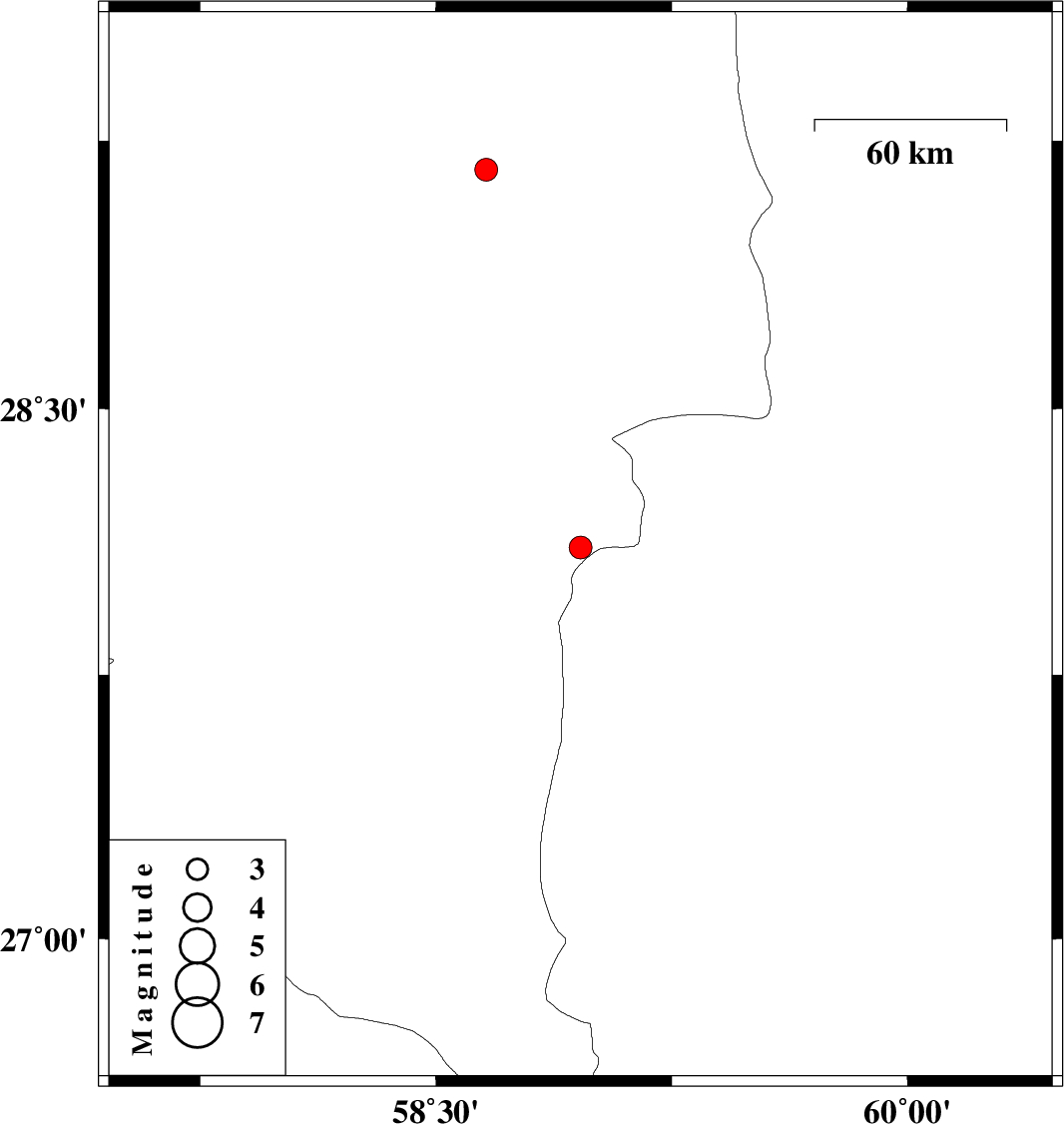 2013/09/22 | 23:13:36.4 | 02:43:36.4 | 28.11 | 58.96 | 18 | ML:3.3 | Kerman Province, 125 km North-East of Kahnuj | ||