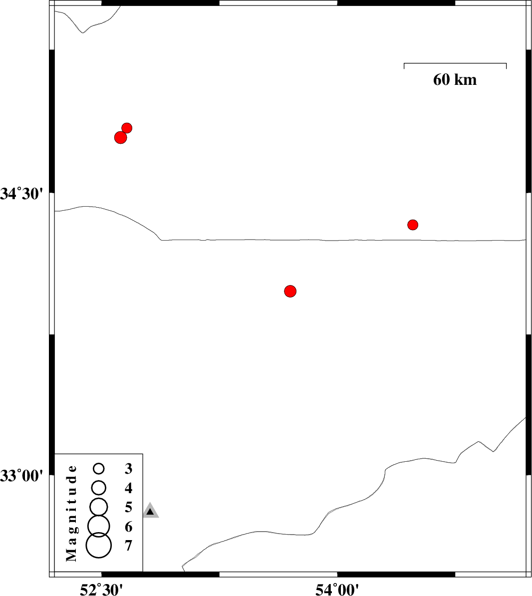 2013/08/25 | 23:58:31.5 | 04:28:31.5 | 34.84 | 52.66 | 26 | ML:3 | Semnan Province, 51 km South-East of Garmsar |