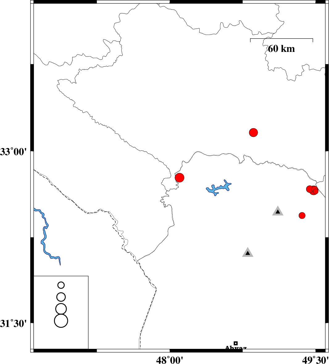 2013/09/16 | 16:05:04.3 | 20:35:04.3 | 32.66 | 49.48 | 15 | ML:4.3 | Khoozestan Province, 46 km North-East of Lali |