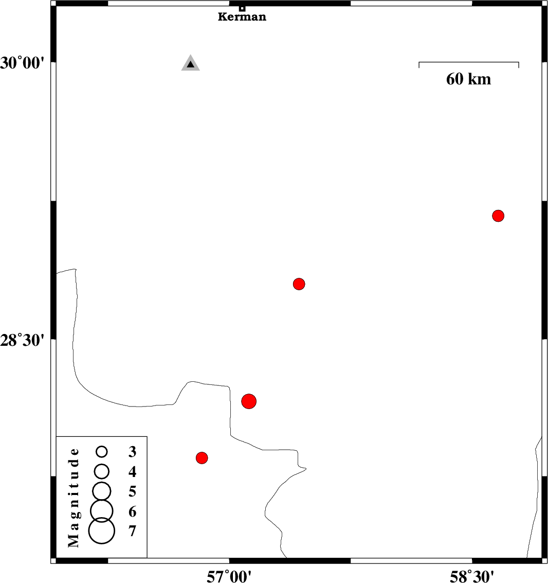2013/09/02 | 00:36:10.3 | 05:06:10.3 | 29.17 | 58.66 | 14 | ML:3.2 | Kerman Province, 31 km East of Bam |