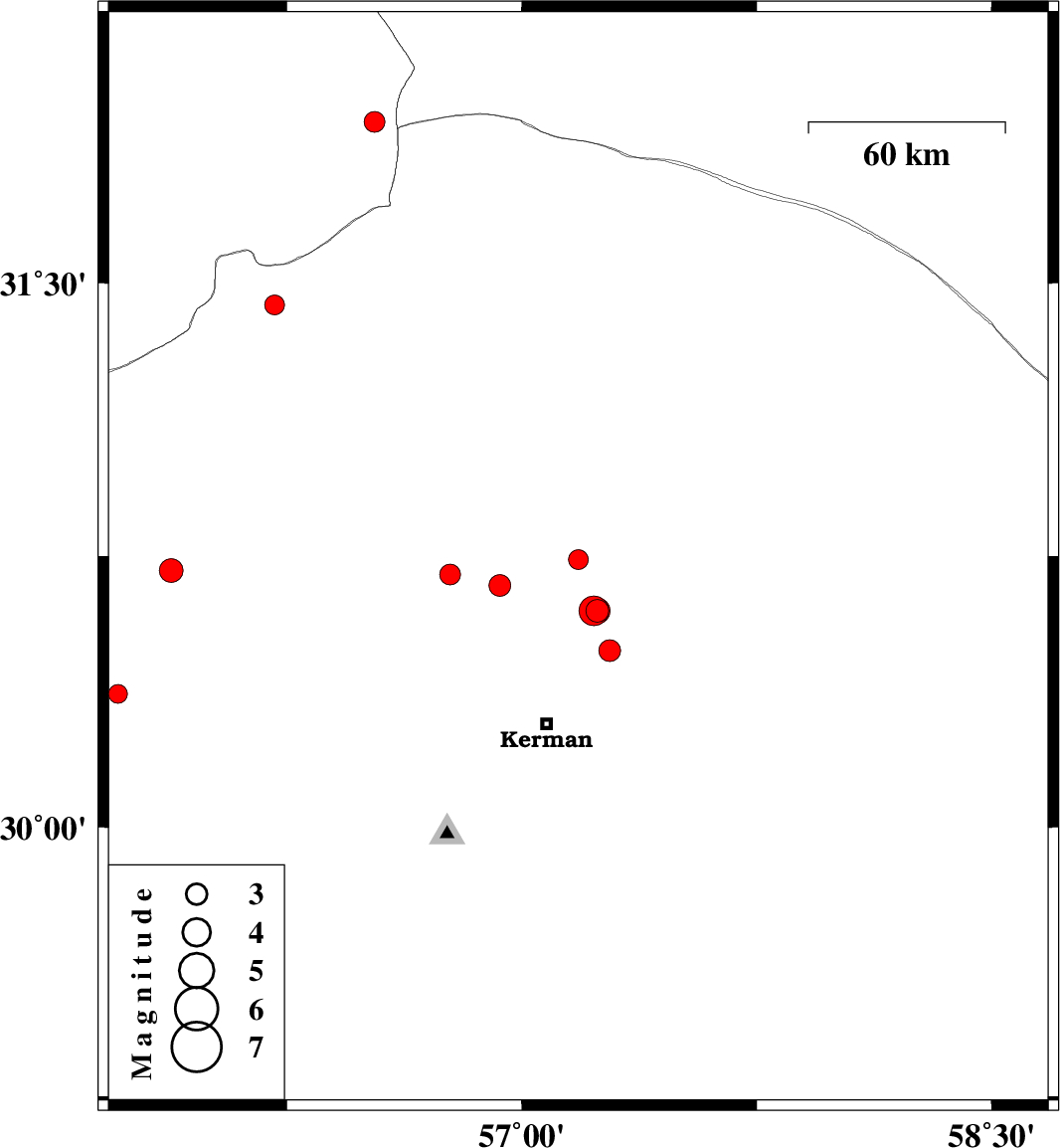 2013/09/24 | 16:12:32.7 | 19:42:32.7 | 30.74 | 57.18 | 15 | ML:2.8 | Kerman Province, 51 km North-East of Kerman | ||