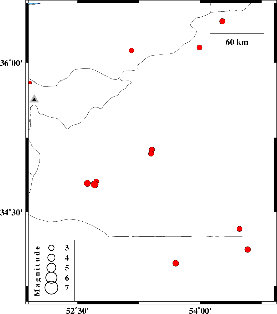 2013/09/27 | 03:57:36.7 | 07:27:36.7 | 34.81 | 52.73 | 14 | ML:2.8 | Semnan Province, 57 km South-East of Garmsar | ||