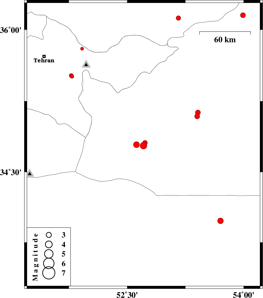 2013/09/27 | 03:57:36.7 | 07:27:36.7 | 34.81 | 52.73 | 14 | ML:2.8 | Semnan Province, 57 km South-East of Garmsar | ||
