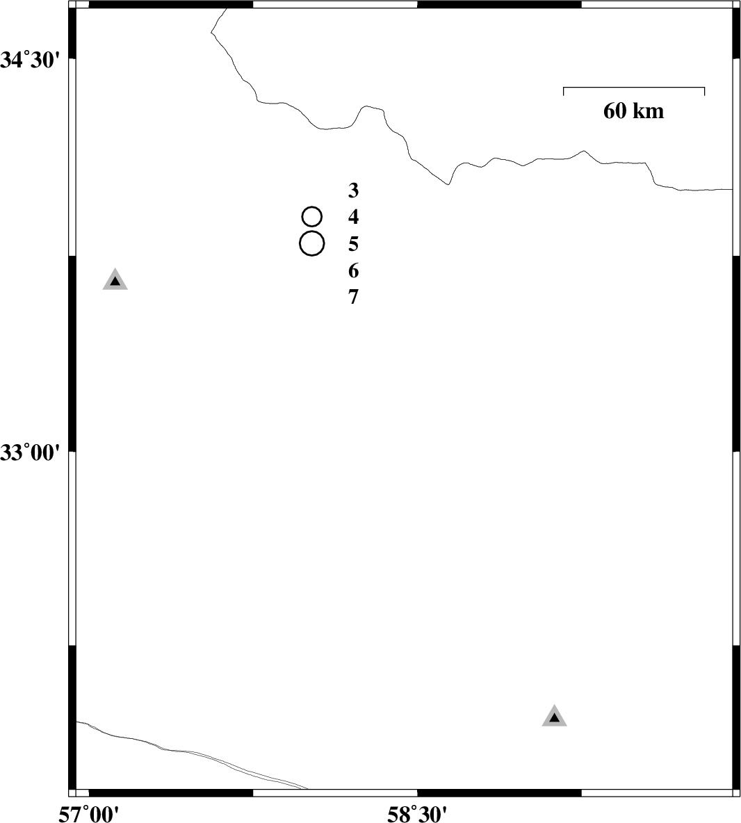 2013/10/02 | 07:15:20.6 | 10:45:20.6 | 33.19 | 58.44 | 16 | ML:3.4 | Khorasan(center) Province, 94 km South-East of Ferdows |