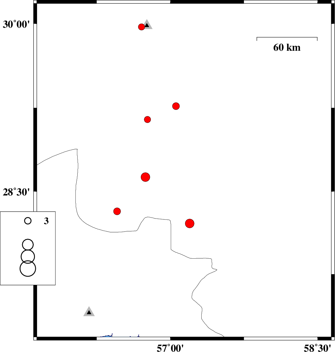 2013/09/24 | 04:43:26.9 | 08:13:26.9 | 28.8 | 57.43 | 15 | ML:3.2 | Kerman Province, 34 km North-West of Jiroft | ||