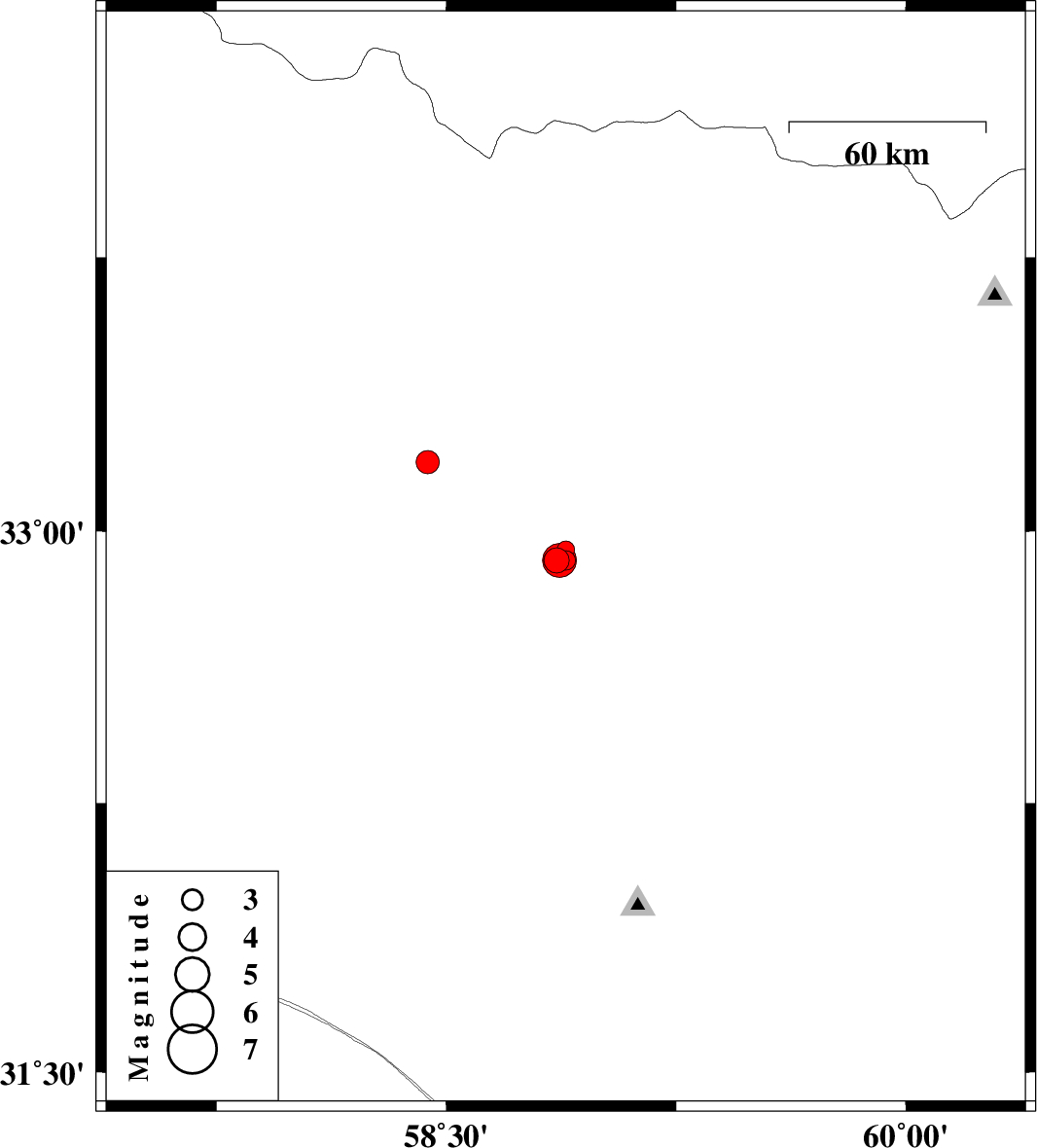 | 2013/10/04 | 18:44:37.3 | 22:14:37.3 | 32.95 | 58.89 | 15 | ML:2.5 | Khorasan(south) Province, 33 km West of Birjand | ||