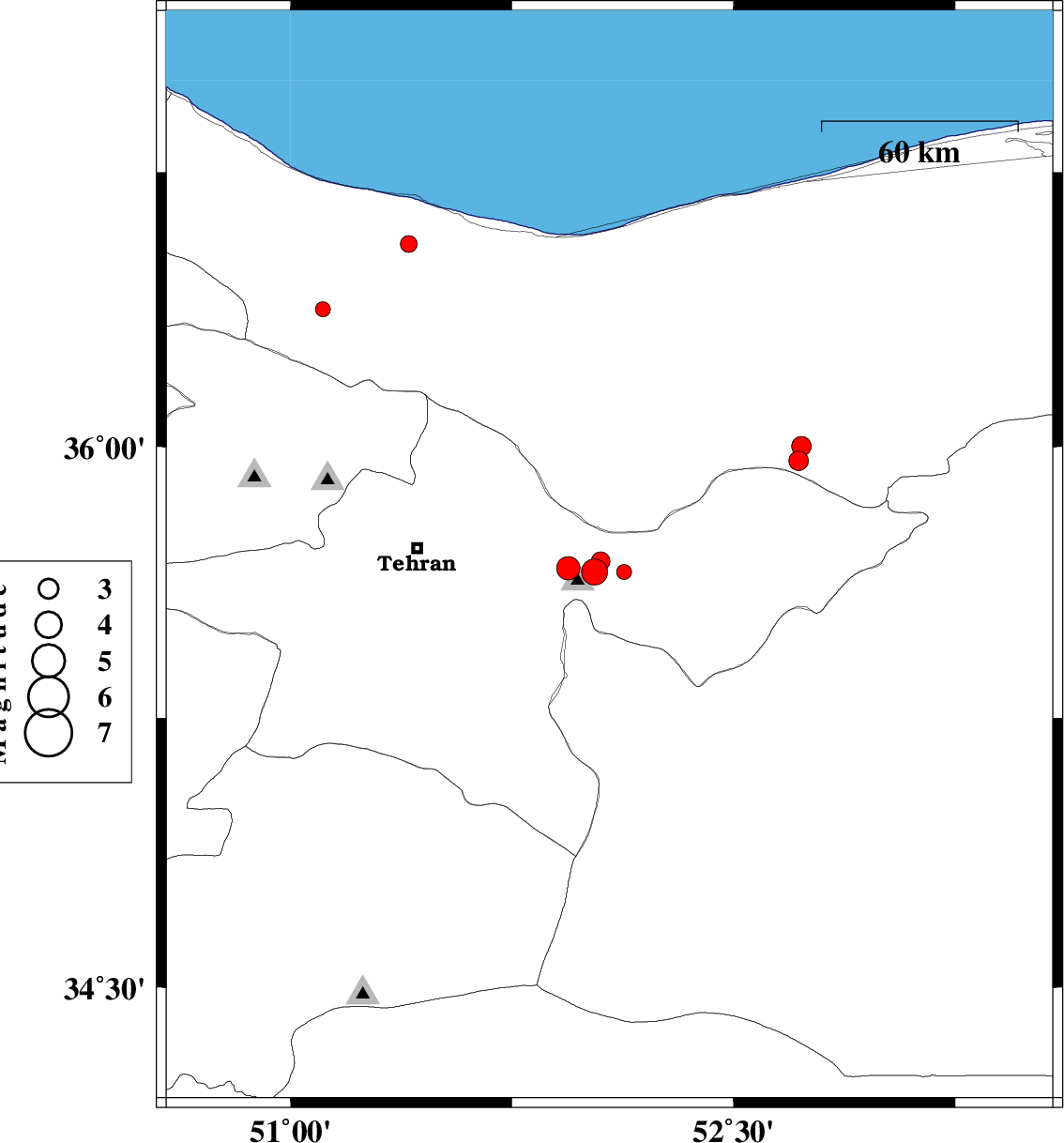 2013/09/27 | 03:57:36.7 | 07:27:36.7 | 34.81 | 52.73 | 14 | ML:2.8 | Semnan Province, 57 km South-East of Garmsar | ||