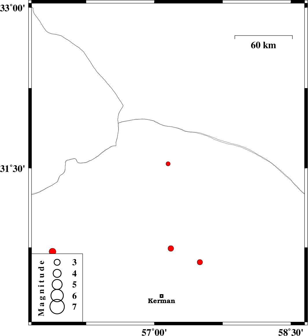 | 2013/09/24 | 16:12:32.7 | 19:42:32.7 | 30.74 | 57.18 | 15 | ML:2.8 | Kerman Province, 51 km North-East of Kerman | ||