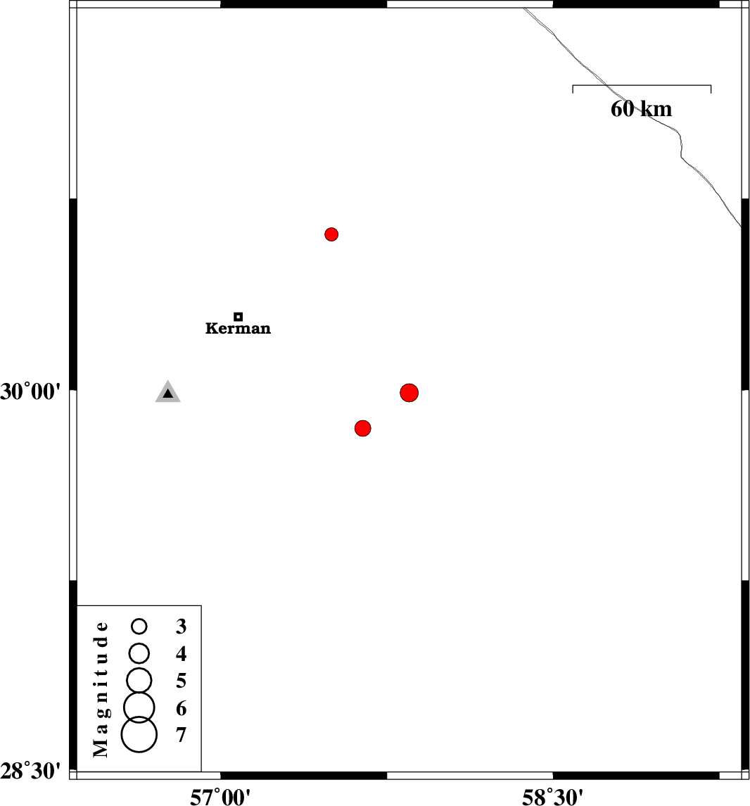 2013/10/09 | 19:11:03.8 | 22:41:03.8 | 30.61 | 57.5 | 14 | ML:2.7 | Kerman Province, 54 km North-East of Kerman |