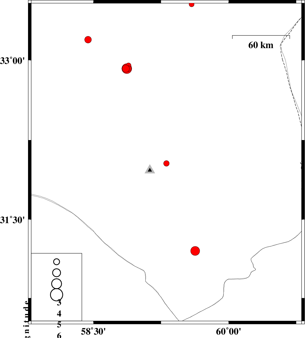 2013/10/05 | 15:56:27.1 | 19:26:27.1 | 32.92 | 58.85 | 14 | ML:2.9 | Khorasan(south) Province, 35 km West of Birjand | ||