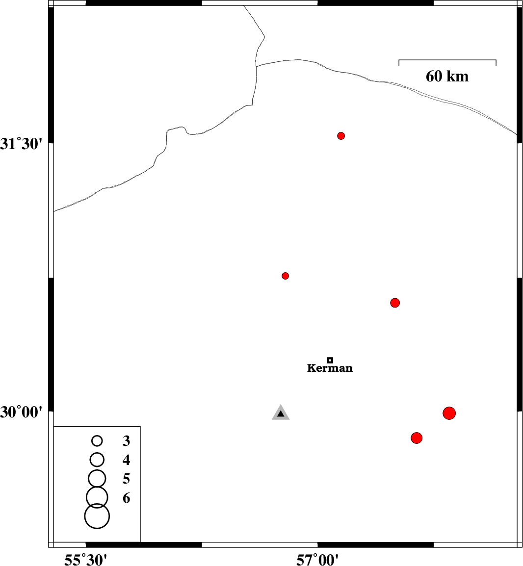 2013/10/13 | 23:12:54.6 | 02:42:54.6 | 29.99 | 57.85 | 15 | ML:3.6 | Kerman Province, 81 km South-East of Kerman | ||