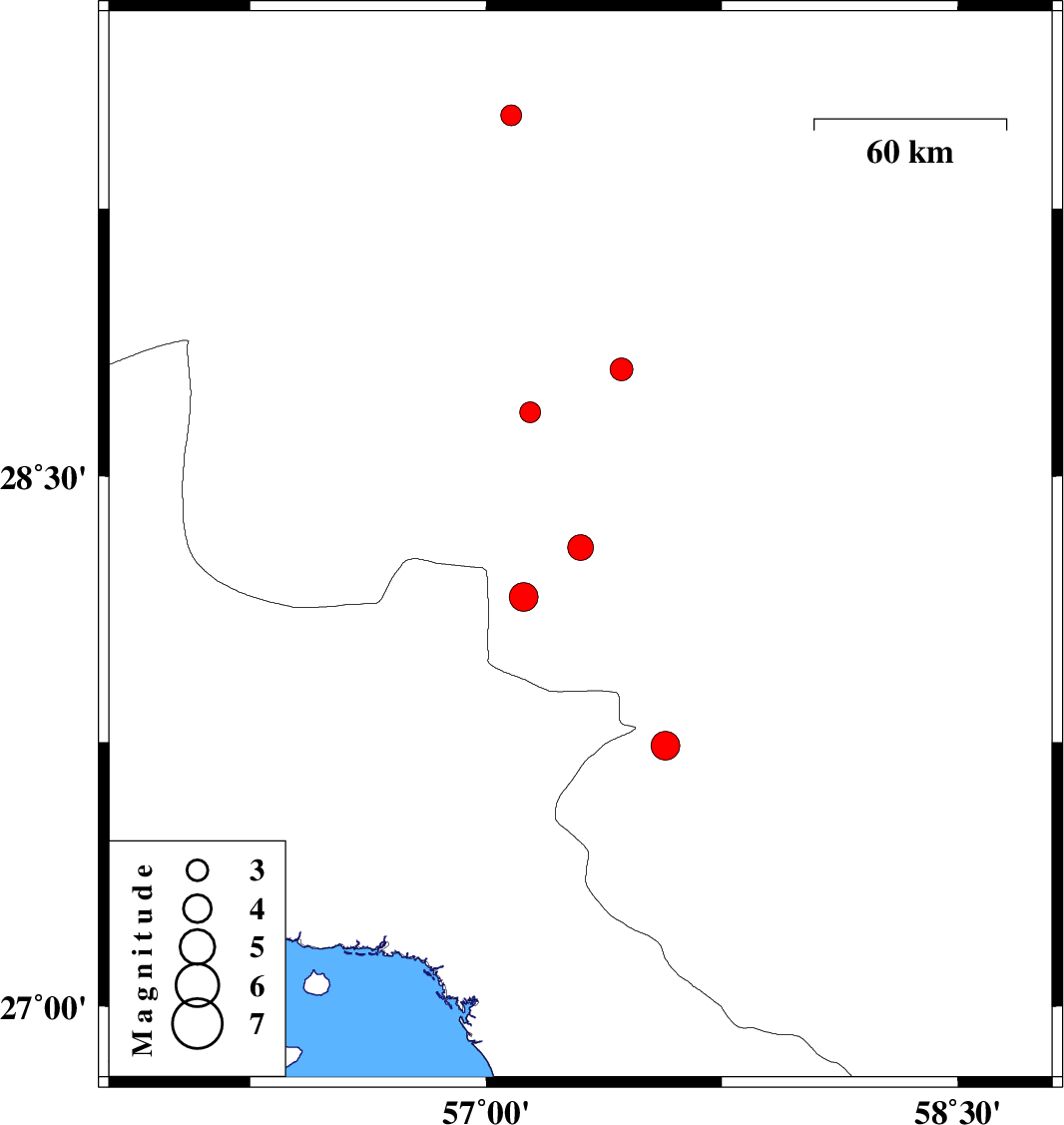 | 2013/10/15 | 12:52:18.8 | 16:22:18.8 | 28.3 | 57.3 | 14 | ML:3.6 | Kerman Province, 55 km North-West of Kahnuj | ||