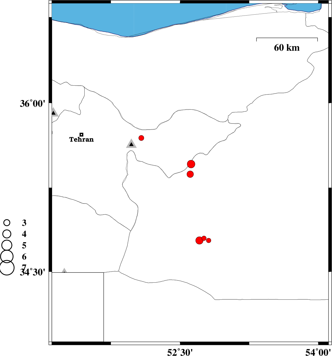 2013/10/08 | 05:51:10.9 | 09:21:10.9 | 34.78 | 52.81 | 21 | ML:2.3 | Semnan Province, 65 km South-East of Garmsar | ||