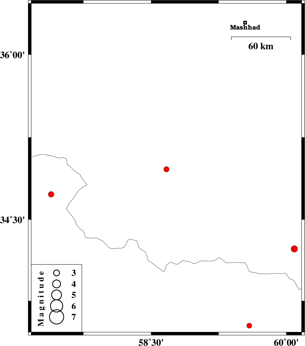 2013/09/21 | 07:53:47.1 | 12:23:47.1 | 34.23 | 60.09 | 28 | ML:3.2 | Khorasan(center) Province, 38 km South of Khaf |