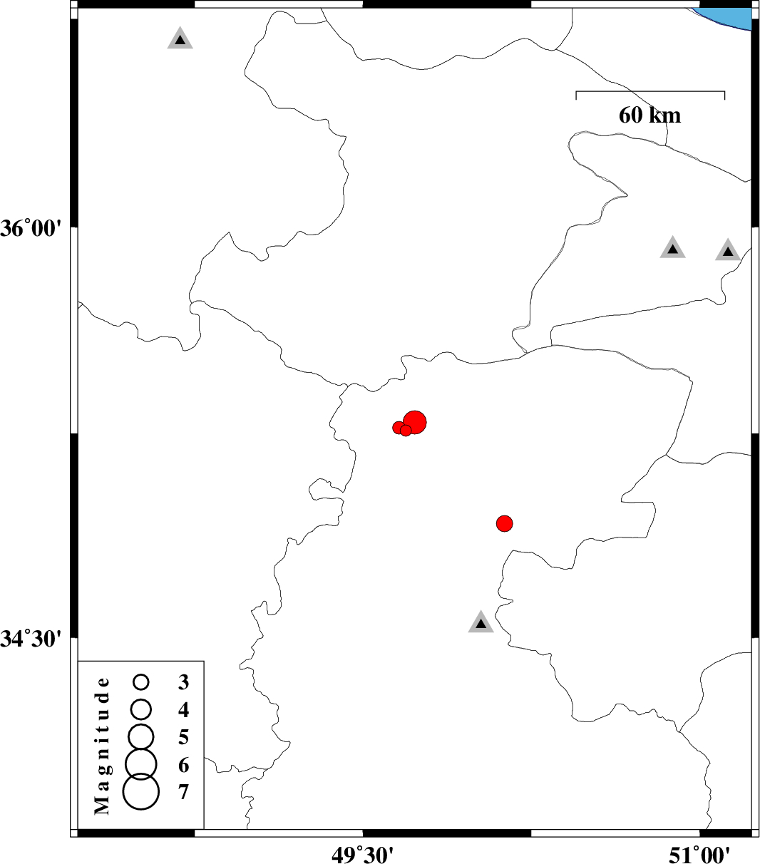 2013/10/16 | 22:14:40.0 | 01:44:40.0 | 34.92 | 50.13 | 14 | ML:3.3 | Markazi Province, 27 km North-East of Tafresh | ||