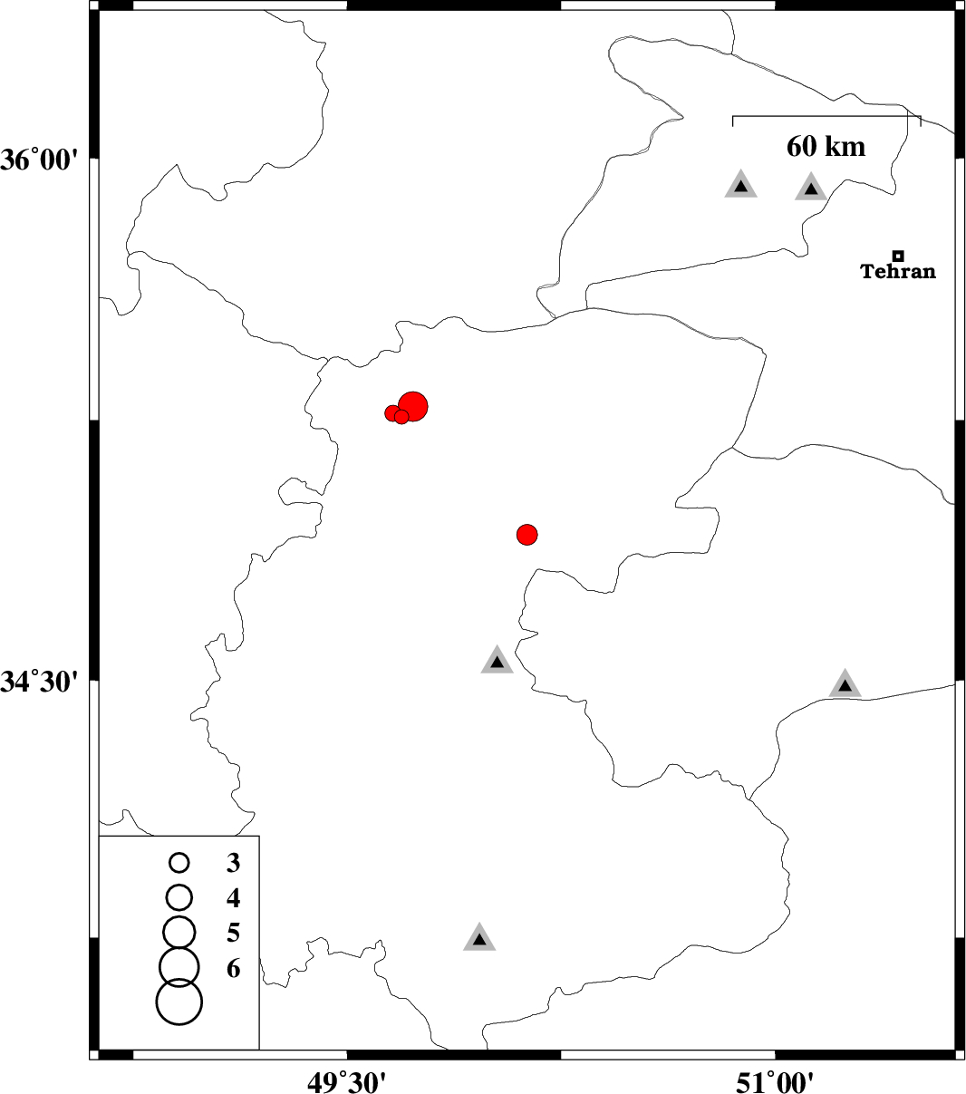 2013/10/16 | 22:14:40.0 | 01:44:40.0 | 34.92 | 50.13 | 14 | ML:3.3 | Markazi Province, 27 km North-East of Tafresh | ||
