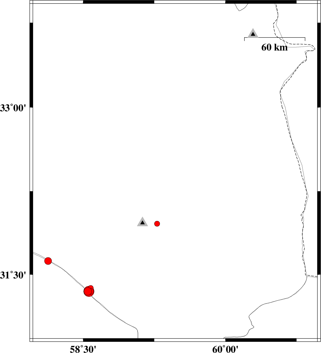 2013/09/26 | 01:16:24.3 | 04:46:24.3 | 31.2 | 59.63 | 14 | ML:4.5 | Khorasan(south) Province, 54 km South-West of Nehbandan | ||